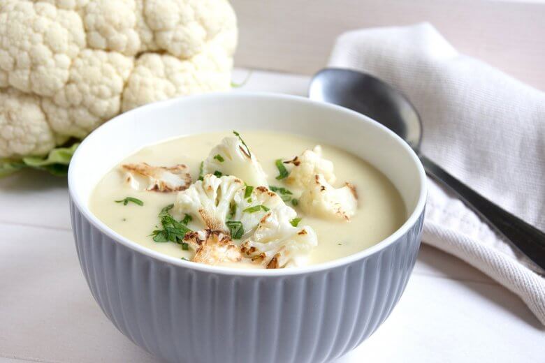 Eigelb mit 4 EL Sahne verquirlen. In die Suppe rühren. Mit Streuwürze, Muskat und eventuell noch mit etwa Salz abschmecken. Blumenkohlröschen reingeben und die Blumenkohlsuppe servieren.