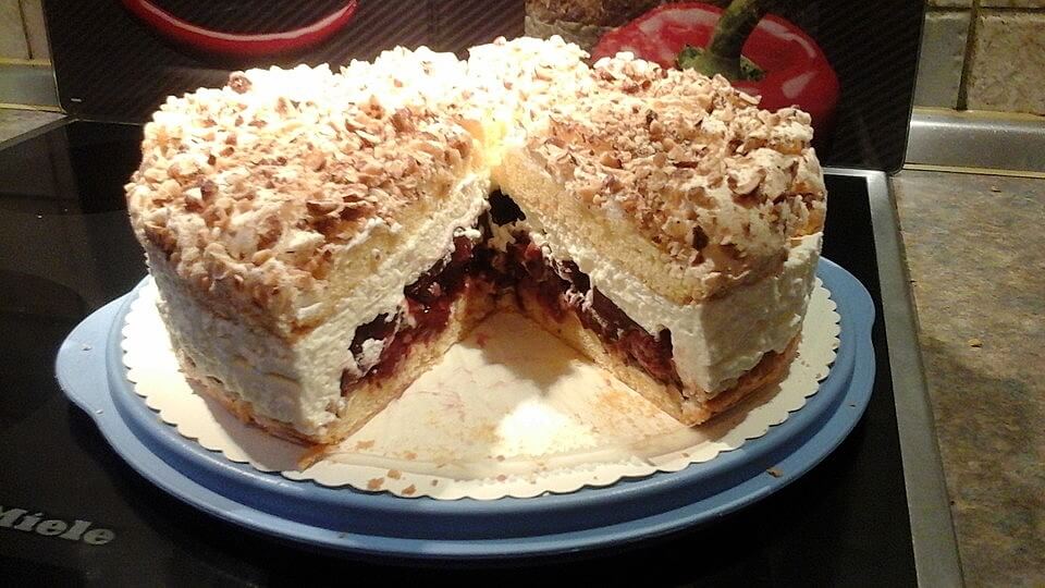 Sauerkirschsaft abgießen und auf ca. 400 – 450 ml mit Wasser auffüllen. Etwas abnehmen und das Vanillepuddingpulver damit anrühren. Restlichen Kirschsaft erhitzen und das angerührte Puddingpulver einrühren. Aufkochen und wenn es andickt, vom Herd nehmen und die Sauerkirschen dazugeben. Kurz abkühlen lassen und auf dem unteren Boden verteilen. Die Kirschfüllung vollständig abkühlen lassen.