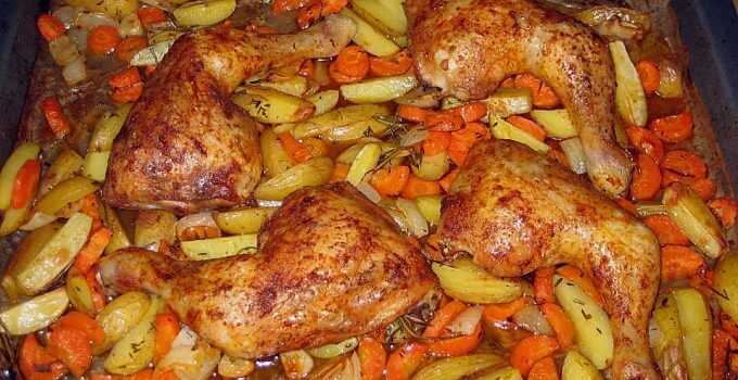 Nach ca. 35 – 40 Minuten Gesamtzeit im Ofen die Hähnchenschenkel mit dem Ofengemüse servieren und die Schmandcreme dazureichen.