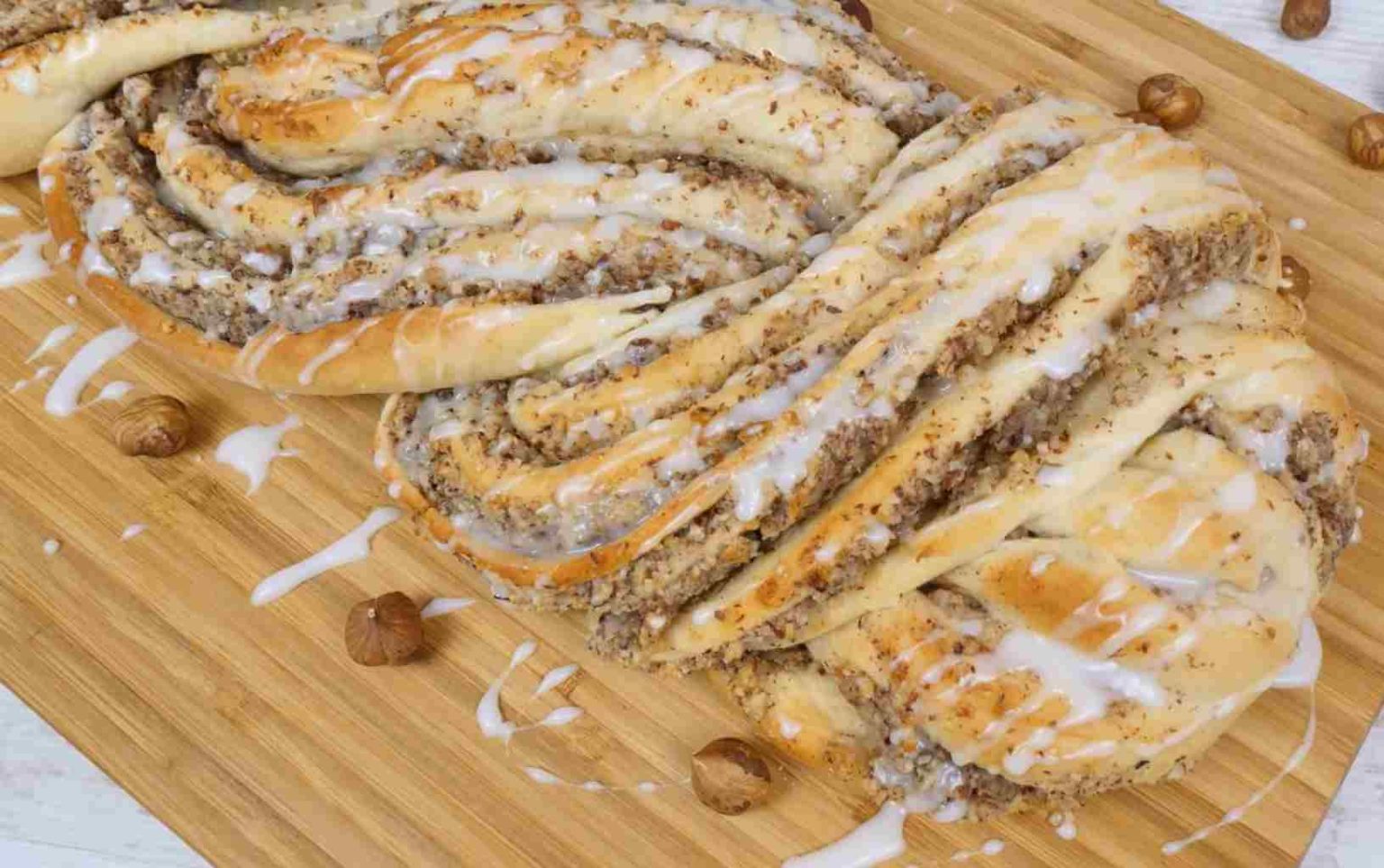 Teig zu einem Rechteck (ca. 30×20 cm) ausrollen. Die Nussfüllung darauf verstreichen und den Teig aufrollen. In der Mitte halbieren und die zwei Ende miteinander verdrehen.