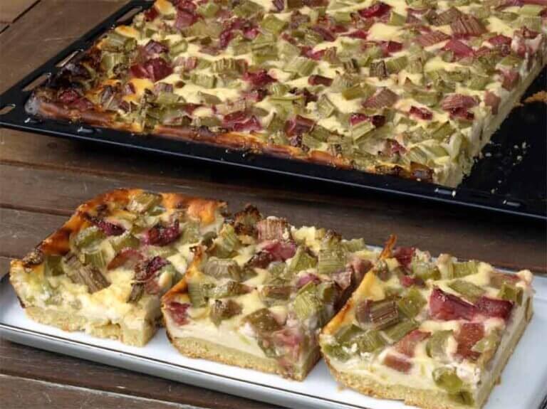 4. Als nachstes den Pudding nun auf den Teig streichen und mit den geputzten Rhabarberstückchen dicht belegen.