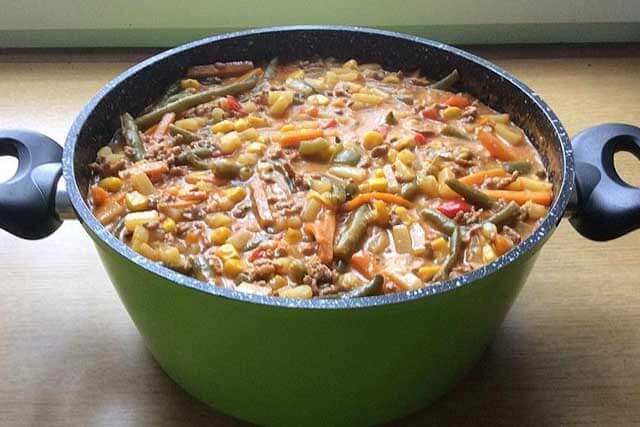 2. Das Öl in einem Suppentopf erhitzen, Hackfleisch darin anbraten. Danach die Zwiebel und Knoblauch dazugeben, würzen, mit Tomatenmark verrühren und mit der Brühe angießen. Dann das gewürfelte Gemüse, die Bohnen und den Mais dazugeben. Einmal umrühren, zugedeckt auf niedriger Stufe ca. 35 Min köcheln lassen.